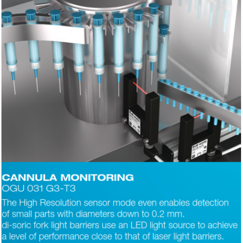 di-soric Photoelectric Fork Sensors are working on the principle of through beam sensors. Transmitter, receiver and all the electronics are in one metal casing ensuring a very simple and quick installation. Complex brackets for fastening the transmitter and receiver as well as time-consuming adjustment are unnecessary.