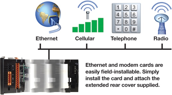 The XL Series comes with a wide range of field installable add-on communications options. You can select from the following: 10/100MBit Ethernet, GSM/GPRS cellular, telephone modem and radio modems. All options support remote Cscape™ programming, Modbus master and slave and OPC. The GSM/GPRS cellular also support Modbus/TCP slave. A GPS receiver unit is also available for mobile applications.